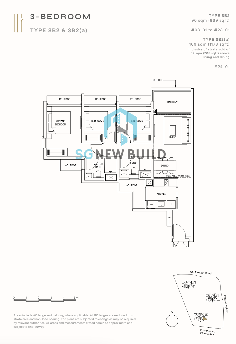 | 3-Bedroom | 3B1, 3B2 | 90 | 969 | 68 | 30.6% |